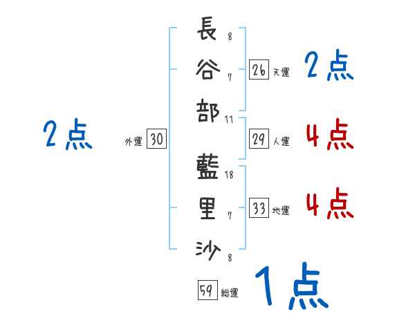 天運![]() | 長谷部藍里沙さんの天運は26画の2つ星!波瀾万丈かも。信頼できる人を大事にしましょう。 家系が持つ宿命的な運勢を表します。祖先から受け継いだ苗字ですので自分の力が及びません。家柄を象徴します。 |