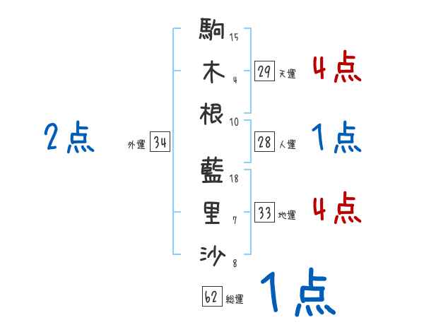 天運![]() | 駒木根藍里沙さんの天運は29画の4つ星!完全主義で才能がある。厳格な心の持ち主。 家系が持つ宿命的な運勢を表します。祖先から受け継いだ苗字ですので自分の力が及びません。家柄を象徴します。 |