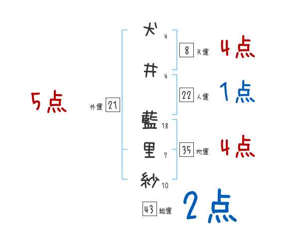 総運![]() | 犬井藍里紗さんの総運は43画の2つ星!頑固な性格で独立心が強いかも。やや非現実的で浪費に注意しましょう。 あなたの人生を表す1番重要な運勢です。生涯を通じて影響する総合運となり、主に50歳以降の晩年期に影響を及ぼします。 |