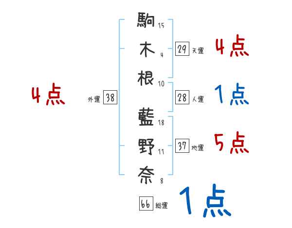 外運![]() | 駒木根藍野奈さんの外運は38画の4つ星!温厚な性格で技術的な才能を発揮する。職人的な仕事に向いている。 生活面を象徴する運勢です。外部から受ける影響力を表し、結婚運、家庭運や職場、環境への順応性を表します。 |