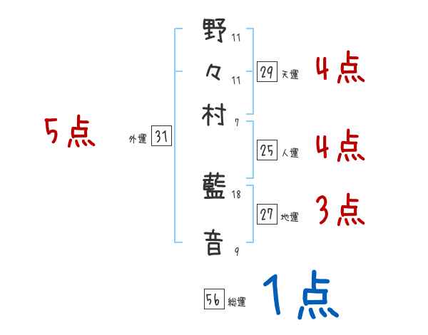 総運![]() | 野々村藍音さんの総運は56画の1つ星!消極的で無気力になりがち。誠実な気持ちが必要でしょう。 あなたの人生を表す1番重要な運勢です。生涯を通じて影響する総合運となり、主に50歳以降の晩年期に影響を及ぼします。 |