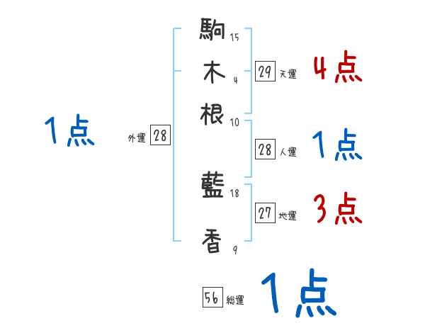 外運![]() | 駒木根藍香さんの外運は28画の1つ星!家庭環境に注意。スポーツで活躍できる能力があるかも。 生活面を象徴する運勢です。外部から受ける影響力を表し、結婚運、家庭運や職場、環境への順応性を表します。 |