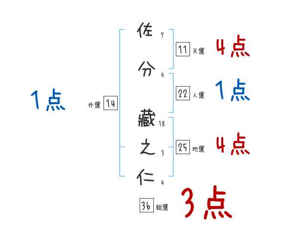 天運![]() | 佐分藏之仁さんの天運は11画の4つ星!着実に富や地位を得る幸運な人生。 家系が持つ宿命的な運勢を表します。祖先から受け継いだ苗字ですので自分の力が及びません。家柄を象徴します。 |