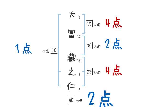 総運![]() | 大冨藏之仁さんの総運は40画の2つ星!自信過剰で物事に固執するためトラブルに注意。 あなたの人生を表す1番重要な運勢です。生涯を通じて影響する総合運となり、主に50歳以降の晩年期に影響を及ぼします。 |