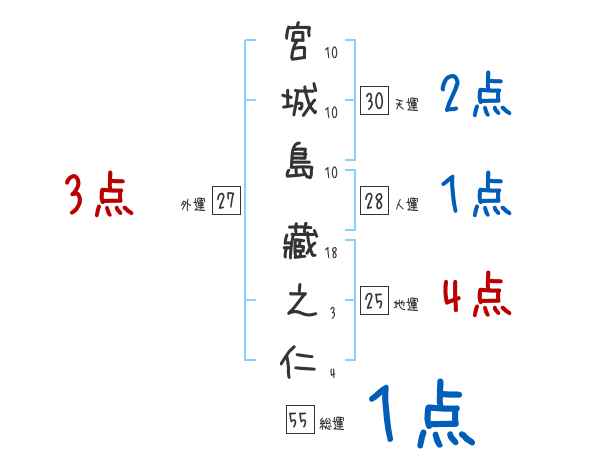 天運![]() | 宮城島藏之仁さんの天運は30画の2つ星!浮き沈みの激しさに注意しましょう。 家系が持つ宿命的な運勢を表します。祖先から受け継いだ苗字ですので自分の力が及びません。家柄を象徴します。 |