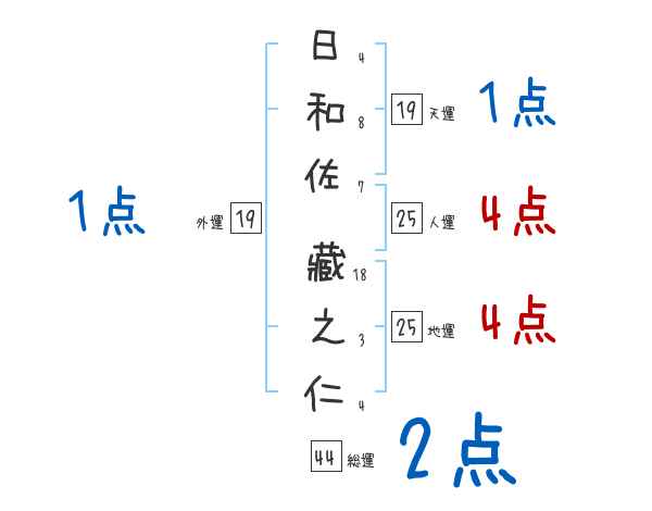 総運![]() | 日和佐藏之仁さんの総運は44画の2つ星!誠実で慎重な性格。物事を考えすぎないように注意しましょう。 あなたの人生を表す1番重要な運勢です。生涯を通じて影響する総合運となり、主に50歳以降の晩年期に影響を及ぼします。 |