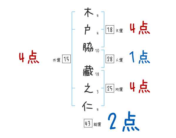 総運![]() | 木戸脇藏之仁さんの総運は43画の2つ星!頑固な性格で独立心が強いかも。やや非現実的で浪費に注意しましょう。 あなたの人生を表す1番重要な運勢です。生涯を通じて影響する総合運となり、主に50歳以降の晩年期に影響を及ぼします。 |