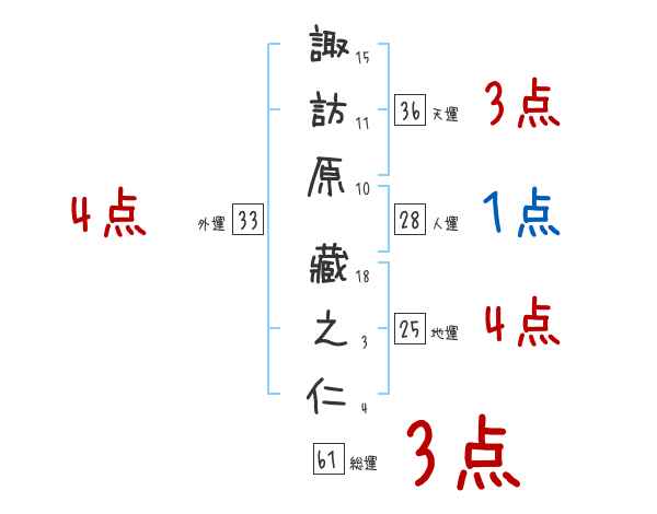 天運![]() | 諏訪原藏之仁さんの天運は36画の3つ星!先見性が豊かです。多少神経質で苦労することも。 家系が持つ宿命的な運勢を表します。祖先から受け継いだ苗字ですので自分の力が及びません。家柄を象徴します。 |