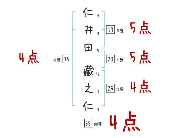 人運![]() | 仁井田藏之仁さんの人運は23画の5つ星!想像力に優れ活力がある。一代で成功し名誉を手に入れる。 性格や才能などを表す2番目に重要な運勢です。人間関係や協調性、社会的な成功に影響します。主に20歳から50歳ぐらいまでの中年期の運勢を表します。 |