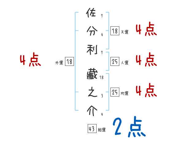 天運![]() | 佐分利藏之介さんの天運は18画の4つ星!情熱的で剛気。忍耐力があり信頼される。 家系が持つ宿命的な運勢を表します。祖先から受け継いだ苗字ですので自分の力が及びません。家柄を象徴します。 |