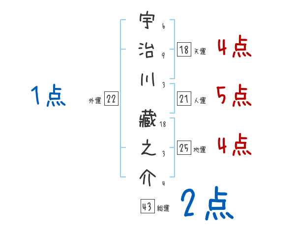 総運![]() | 宇治川藏之介さんの総運は43画の2つ星!頑固な性格で独立心が強いかも。やや非現実的で浪費に注意しましょう。 あなたの人生を表す1番重要な運勢です。生涯を通じて影響する総合運となり、主に50歳以降の晩年期に影響を及ぼします。 |
