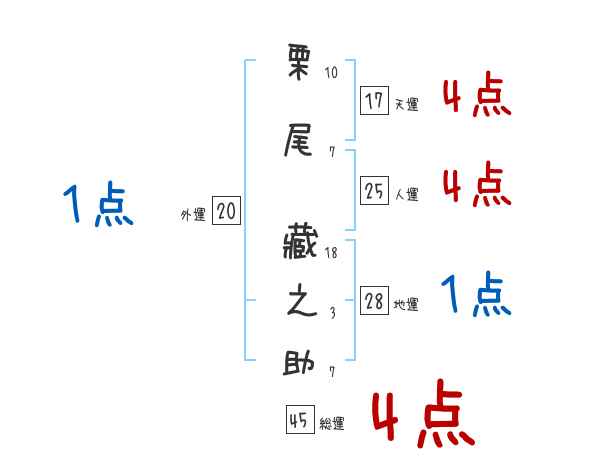 天運![]() | 栗尾藏之助さんの天運は17画の4つ星!積極的な行動力。地位を気づき財産を手に入れる。純粋な心と直感力。 家系が持つ宿命的な運勢を表します。祖先から受け継いだ苗字ですので自分の力が及びません。家柄を象徴します。 |