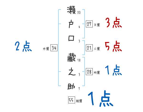 総運![]() | 瀬戸口藏之助さんの総運は55画の1つ星!欲張りな性格で軽率な行動に注意しましょう。病気に気をつけて。 あなたの人生を表す1番重要な運勢です。生涯を通じて影響する総合運となり、主に50歳以降の晩年期に影響を及ぼします。 |