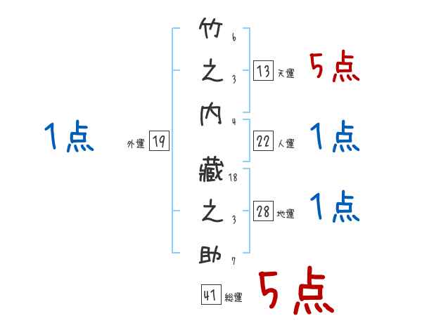 総運![]() | 竹之内藏之助さんの総運は41画の5つ星!大志を抱き、目標に向かって実力を発揮し達成する。温和な性格。 あなたの人生を表す1番重要な運勢です。生涯を通じて影響する総合運となり、主に50歳以降の晩年期に影響を及ぼします。 |