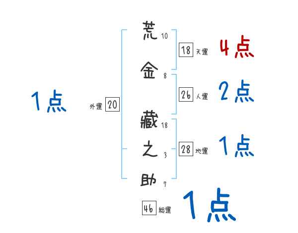 天運![]() | 荒金藏之助さんの天運は18画の4つ星!情熱的で剛気。忍耐力があり信頼される。 家系が持つ宿命的な運勢を表します。祖先から受け継いだ苗字ですので自分の力が及びません。家柄を象徴します。 |