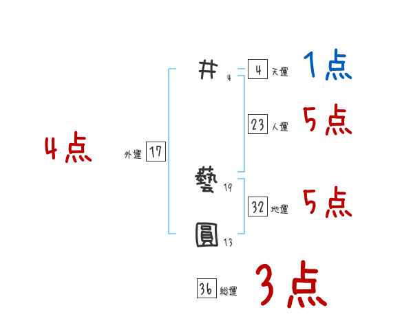 天運![]() | 井藝圓さんの天運は4画の1つ星!感情が不安定で苦労するかも。周囲との協調を心掛けましょう。 家系が持つ宿命的な運勢を表します。祖先から受け継いだ苗字ですので自分の力が及びません。家柄を象徴します。 |