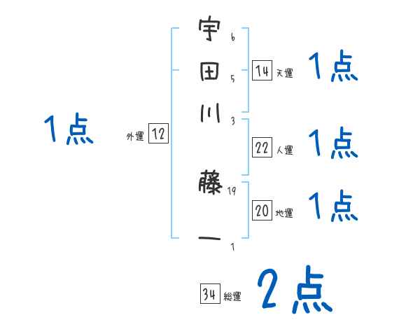 総運![]() | 宇田川藤一さんの総運は34画の2つ星!独創性に優れるが、自尊心が強く災難に注意しましょう。 あなたの人生を表す1番重要な運勢です。生涯を通じて影響する総合運となり、主に50歳以降の晩年期に影響を及ぼします。 |