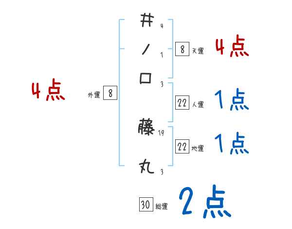 総運![]() | 井ノ口藤丸さんの総運は30画の2つ星!浮き沈みの激しさに注意しましょう。 あなたの人生を表す1番重要な運勢です。生涯を通じて影響する総合運となり、主に50歳以降の晩年期に影響を及ぼします。 |