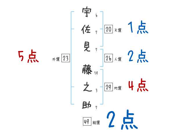 外運![]() | 宇佐見藤之助さんの外運は23画の5つ星!想像力に優れ活力がある。一代で成功し名誉を手に入れる。 生活面を象徴する運勢です。外部から受ける影響力を表し、結婚運、家庭運や職場、環境への順応性を表します。 |
