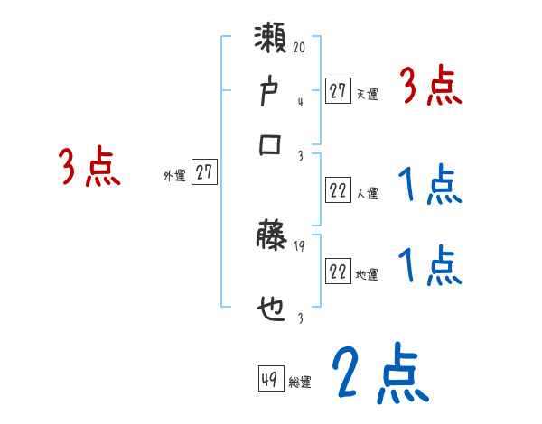 天運![]() | 瀬戸口藤也さんの天運は27画の3つ星!頭脳明晰だが強情で摩擦が多い傾向。孤立に注意。 家系が持つ宿命的な運勢を表します。祖先から受け継いだ苗字ですので自分の力が及びません。家柄を象徴します。 |