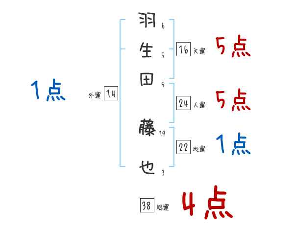 外運![]() | 羽生田藤也さんの外運は14画の1つ星!人に対して優しいがストレスを溜め込みがち。人間関係のトラブルを避けるよう気をつけましょう。 生活面を象徴する運勢です。外部から受ける影響力を表し、結婚運、家庭運や職場、環境への順応性を表します。 |