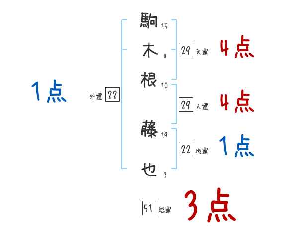 外運![]() | 駒木根藤也さんの外運は22画の1つ星!努力することが苦手ないっぽう手先が器用。芸術性にも優れる。 生活面を象徴する運勢です。外部から受ける影響力を表し、結婚運、家庭運や職場、環境への順応性を表します。 |