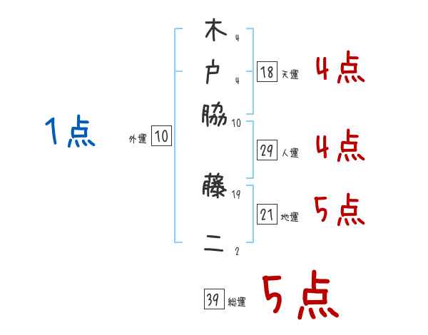 総運![]() | 木戸脇藤二さんの総運は39画の5つ星!社交性に優れ人望が厚い。人の上に立ち成功する。 あなたの人生を表す1番重要な運勢です。生涯を通じて影響する総合運となり、主に50歳以降の晩年期に影響を及ぼします。 |