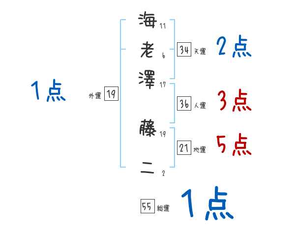 外運![]() | 海老澤藤二さんの外運は19画の1つ星!優れた才能を持ちますが、協調性が足りないことも。周りの人と協力する事を意識しましょう。 生活面を象徴する運勢です。外部から受ける影響力を表し、結婚運、家庭運や職場、環境への順応性を表します。 |