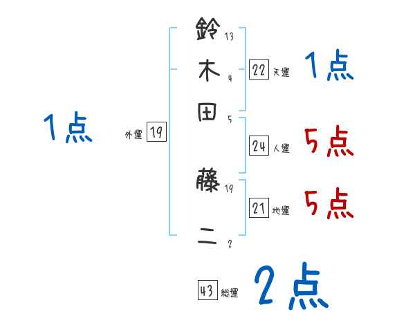 総運![]() | 鈴木田藤二さんの総運は43画の2つ星!頑固な性格で独立心が強いかも。やや非現実的で浪費に注意しましょう。 あなたの人生を表す1番重要な運勢です。生涯を通じて影響する総合運となり、主に50歳以降の晩年期に影響を及ぼします。 |