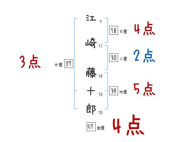 天運![]() | 江崎藤十郎さんの天運は18画の4つ星!情熱的で剛気。忍耐力があり信頼される。 家系が持つ宿命的な運勢を表します。祖先から受け継いだ苗字ですので自分の力が及びません。家柄を象徴します。 |