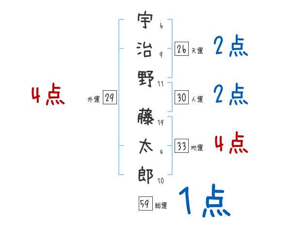 地運![]() | 宇治野藤太郎さんの地運は33画の4つ星!権力志向でプライドが高い。勇気があり運を切り開き成功する。 個性を表す基礎的な運勢です。性格形成や対人関係、行動力など家庭環境に影響されます。主に誕生してから20歳くらいまでの若年期の運勢を表します。 |
