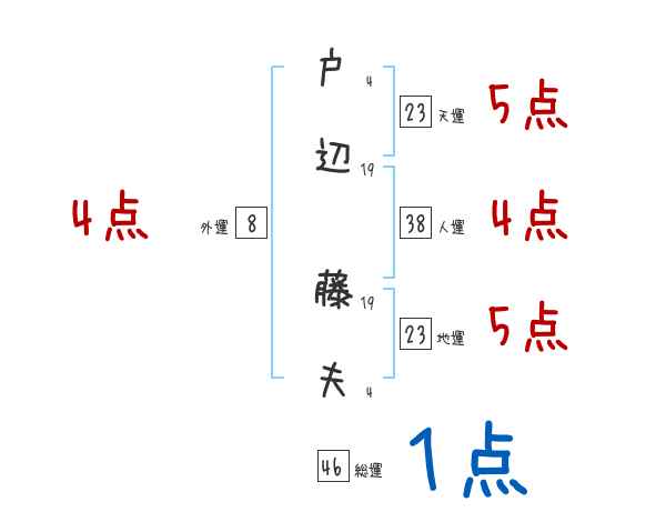 天運![]() | 戸辺藤夫さんの天運は23画の5つ星!想像力に優れ活力がある。一代で成功し名誉を手に入れる。 家系が持つ宿命的な運勢を表します。祖先から受け継いだ苗字ですので自分の力が及びません。家柄を象徴します。 |