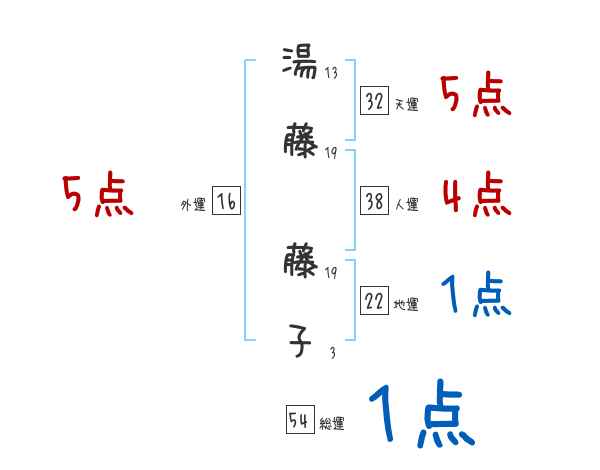 天運![]() | 湯藤藤子さんの天運は32画の5つ星!柔軟性があり成功する。チャンスが多く金運が良い。 家系が持つ宿命的な運勢を表します。祖先から受け継いだ苗字ですので自分の力が及びません。家柄を象徴します。 |