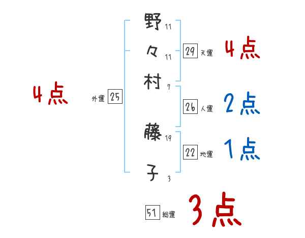 天運![]() | 野々村藤子さんの天運は29画の4つ星!完全主義で才能がある。厳格な心の持ち主。 家系が持つ宿命的な運勢を表します。祖先から受け継いだ苗字ですので自分の力が及びません。家柄を象徴します。 |