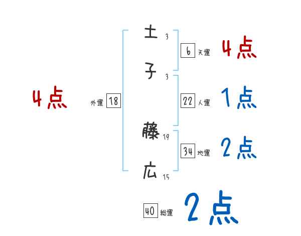 天運![]() | 土子藤広さんの天運は6画の4つ星!慎重な努力家で信頼を得る。誠実な精神で向上心に優れる。 家系が持つ宿命的な運勢を表します。祖先から受け継いだ苗字ですので自分の力が及びません。家柄を象徴します。 |