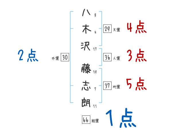 天運![]() | 八木沢藤志朗さんの天運は29画の4つ星!完全主義で才能がある。厳格な心の持ち主。 家系が持つ宿命的な運勢を表します。祖先から受け継いだ苗字ですので自分の力が及びません。家柄を象徴します。 |