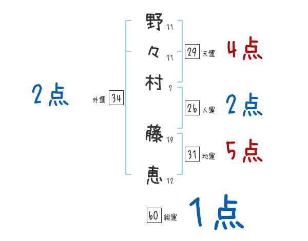 総運![]() | 野々村藤恵さんの総運は60画の1つ星!悲観的で迷いやすい。波乱が多く損をしないように。 あなたの人生を表す1番重要な運勢です。生涯を通じて影響する総合運となり、主に50歳以降の晩年期に影響を及ぼします。 |