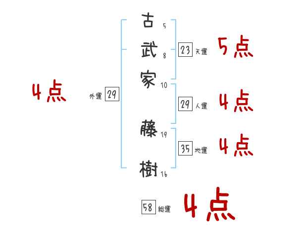 天運![]() | 古武家藤樹さんの天運は23画の5つ星!想像力に優れ活力がある。一代で成功し名誉を手に入れる。 家系が持つ宿命的な運勢を表します。祖先から受け継いだ苗字ですので自分の力が及びません。家柄を象徴します。 |