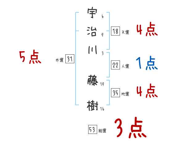 総運![]() | 宇治川藤樹さんの総運は53画の3つ星!やや見栄っ張りで虚栄心がある。散財に注意。 あなたの人生を表す1番重要な運勢です。生涯を通じて影響する総合運となり、主に50歳以降の晩年期に影響を及ぼします。 |