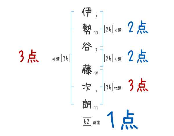 天運![]() | 伊勢谷藤次朗さんの天運は26画の2つ星!波瀾万丈かも。信頼できる人を大事にしましょう。 家系が持つ宿命的な運勢を表します。祖先から受け継いだ苗字ですので自分の力が及びません。家柄を象徴します。 |