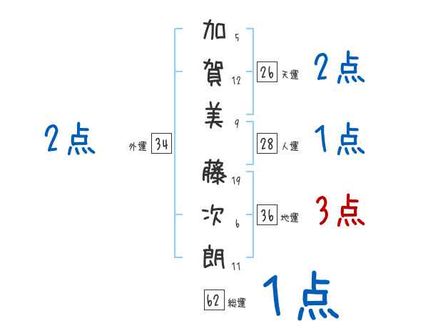 天運![]() | 加賀美藤次朗さんの天運は26画の2つ星!波瀾万丈かも。信頼できる人を大事にしましょう。 家系が持つ宿命的な運勢を表します。祖先から受け継いだ苗字ですので自分の力が及びません。家柄を象徴します。 |
