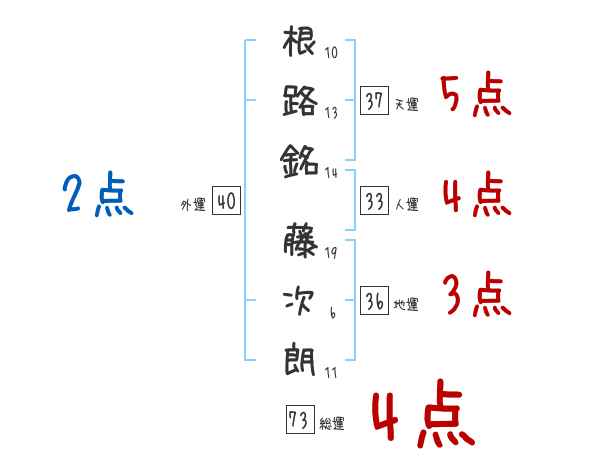 地運![]() | 根路銘藤次朗さんの地運は36画の3つ星!先見性が豊かです。多少神経質で苦労することも。 個性を表す基礎的な運勢です。性格形成や対人関係、行動力など家庭環境に影響されます。主に誕生してから20歳くらいまでの若年期の運勢を表します。 |