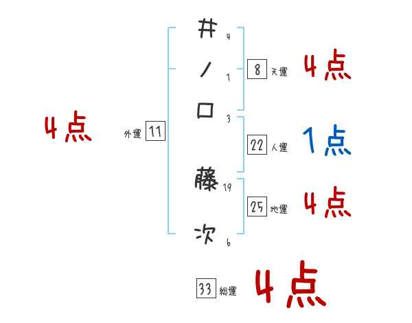 天運![]() | 井ノ口藤次さんの天運は8画の4つ星!勤勉家。根気強く努力し成功する。忍耐力がある。 家系が持つ宿命的な運勢を表します。祖先から受け継いだ苗字ですので自分の力が及びません。家柄を象徴します。 |