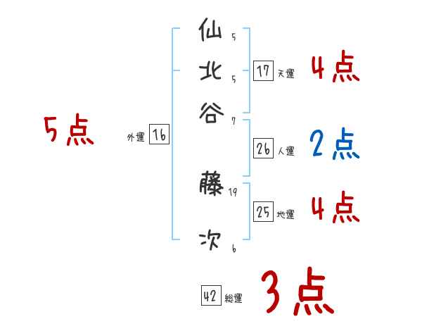 天運![]() | 仙北谷藤次さんの天運は17画の4つ星!積極的な行動力。地位を気づき財産を手に入れる。純粋な心と直感力。 家系が持つ宿命的な運勢を表します。祖先から受け継いだ苗字ですので自分の力が及びません。家柄を象徴します。 |