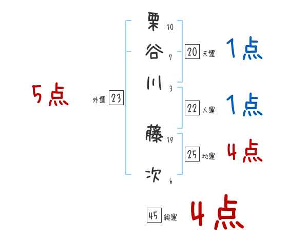 外運![]() | 栗谷川藤次さんの外運は23画の5つ星!想像力に優れ活力がある。一代で成功し名誉を手に入れる。 生活面を象徴する運勢です。外部から受ける影響力を表し、結婚運、家庭運や職場、環境への順応性を表します。 |