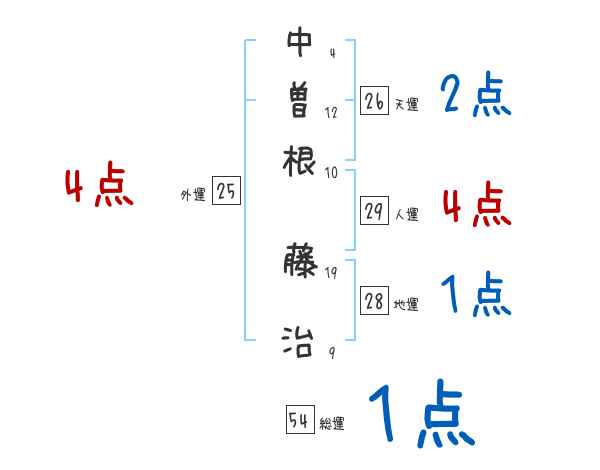 天運![]() | 中曽根藤治さんの天運は26画の2つ星!波瀾万丈かも。信頼できる人を大事にしましょう。 家系が持つ宿命的な運勢を表します。祖先から受け継いだ苗字ですので自分の力が及びません。家柄を象徴します。 |