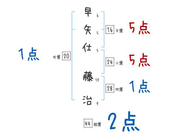 総運![]() | 早矢仕藤治さんの総運は44画の2つ星!誠実で慎重な性格。物事を考えすぎないように注意しましょう。 あなたの人生を表す1番重要な運勢です。生涯を通じて影響する総合運となり、主に50歳以降の晩年期に影響を及ぼします。 |