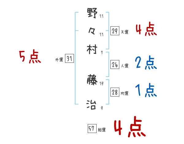 総運![]() | 野々村藤治さんの総運は57画の4つ星!向上心があり人望がある。地位を得る。 あなたの人生を表す1番重要な運勢です。生涯を通じて影響する総合運となり、主に50歳以降の晩年期に影響を及ぼします。 |