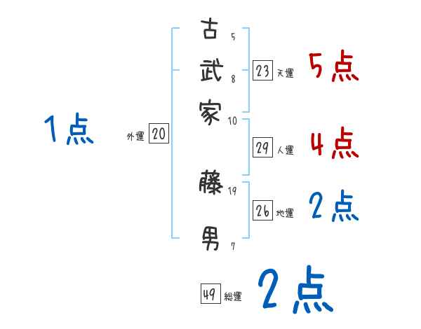 天運![]() | 古武家藤男さんの天運は23画の5つ星!想像力に優れ活力がある。一代で成功し名誉を手に入れる。 家系が持つ宿命的な運勢を表します。祖先から受け継いだ苗字ですので自分の力が及びません。家柄を象徴します。 |