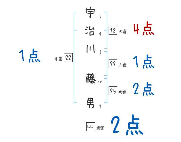総運![]() | 宇治川藤男さんの総運は44画の2つ星!誠実で慎重な性格。物事を考えすぎないように注意しましょう。 あなたの人生を表す1番重要な運勢です。生涯を通じて影響する総合運となり、主に50歳以降の晩年期に影響を及ぼします。 |